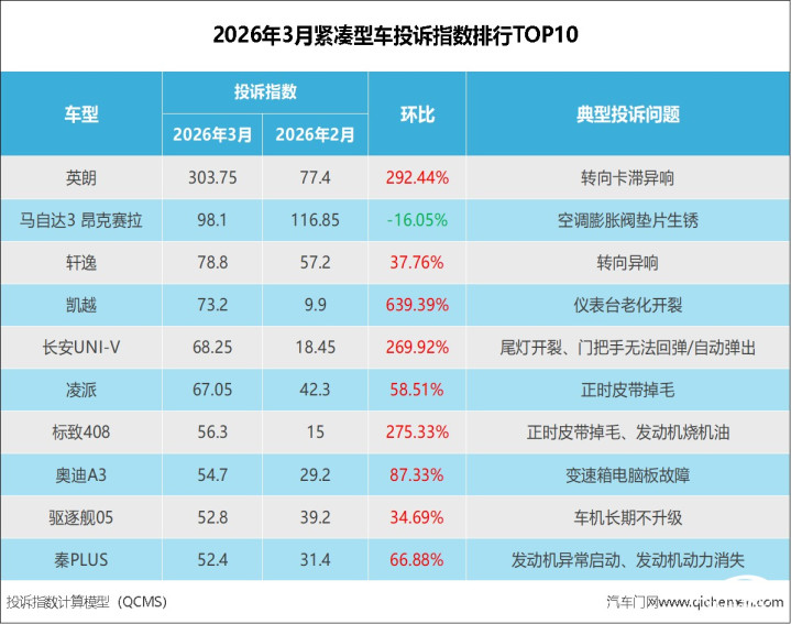 近日,汽车门网发布了2026年3月汽车质量投诉指数。3月,汽车门网紧凑型车投诉指数达到了2270.6,环比大幅上涨了91%。